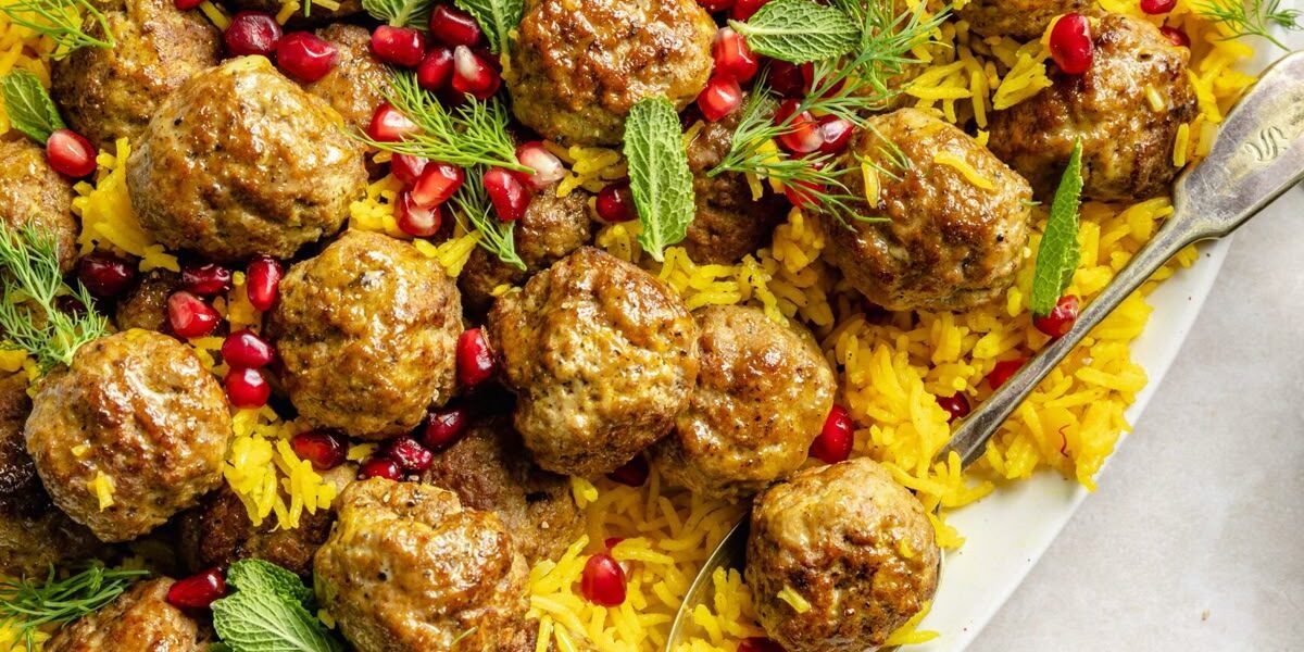 Spread turmeric rice on a large platter. Top with lamb kofta. Sprinkle with fresh herbs and pomegranate arils. Serve tzatziki on the side.