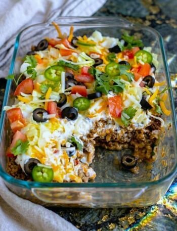 This mouthwatering dish in your image looks like a loaded taco casserole—a rich, cheesy, and flavor-packed comfort food that combines …