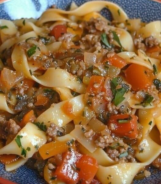 This dish combines wide, silky pappardelle noodles with a slow-simmered sauce made from ground meat, tomatoes, garlic, herbs, and tender vegetables. The result is a deeply flavorful, slightly rustic pasta that’s perfect for family dinners or even upscale entertaining. The wide ribbons of pasta are ideal for holding onto the rich sauce, making every bite satisfying.