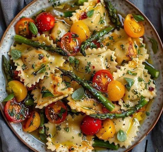 🍝 Mediterranean Ravioli with Tomatoes, Asparagus, Garlic & Herbs