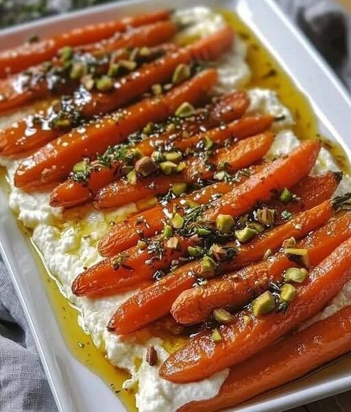 This Roasted Carrots with Whipped Ricotta and Hot Honey dish is a beautiful Mediterranean-inspired appetizer or side. Sweet roasted carrots are caramelized in the oven and served over creamy whipped ricotta, then finished with a drizzle of spicy hot honey and crunchy nuts. The combination of sweet, creamy, spicy, and savory flavors makes it elegant yet simple—perfect for dinner parties or a special family meal.