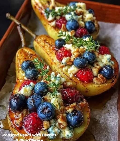 This elegant, sweet-and-savory dish combines caramelized roasted pears with juicy berries and tangy blue cheese. It’s a beautiful balance of flavors—warm, soft fruit paired with creamy, slightly sharp cheese and a touch of honey. Perfect as a light dessert, brunch dish, or even a sophisticated appetizer.