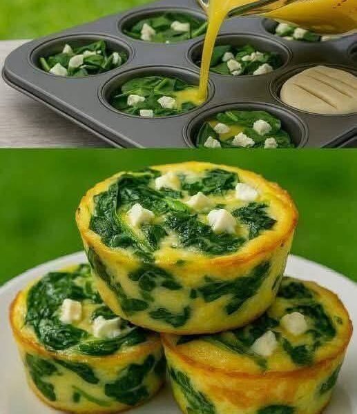 4. Evenly distribute chopped spinach and feta into each muffin cup.