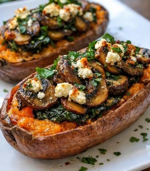This dish features roasted sweet potatoes filled with a savory sauté of mushrooms, spinach, garlic, herbs, and creamy feta cheese. It’s vegetarian, gluten-free, and easily adaptable for Mediterranean, anti-inflammatory, and clean-eating lifestyles.