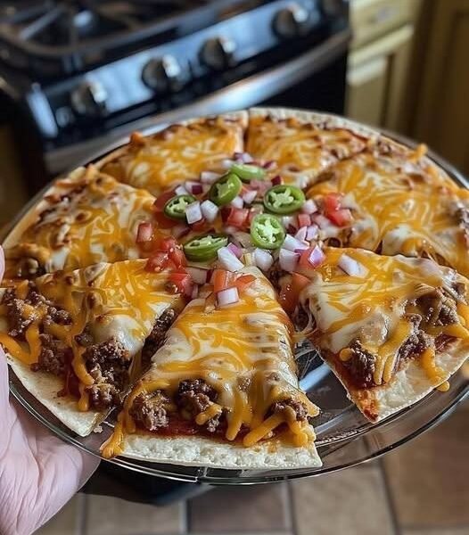 This taco pizza combines the bold flavors of tacos with the comfort of pizza. A crispy crust is layered with refried beans or sauce, spiced ground beef, gooey melted cheese, and finished with fresh toppings like diced tomatoes, onions, and jalapeños. It’s perfect for weeknight dinners, game day food, or party appetizers.