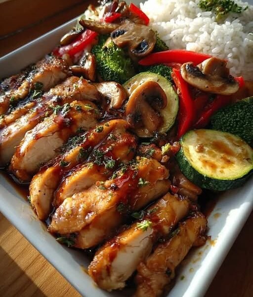 Teriyaki Glazed Chicken with Stir-Fried Vegetables and Rice…