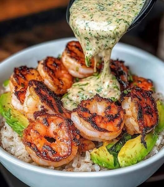 A fresh, vibrant, and protein-packed bowl bursting with juicy shrimp, creamy avocado, fluffy rice, and a bright cilantro-lime drizzle. This Mediterranean-inspired bowl is perfect for lunch or dinner — light yet satisfying, colorful, and full of clean flavors.